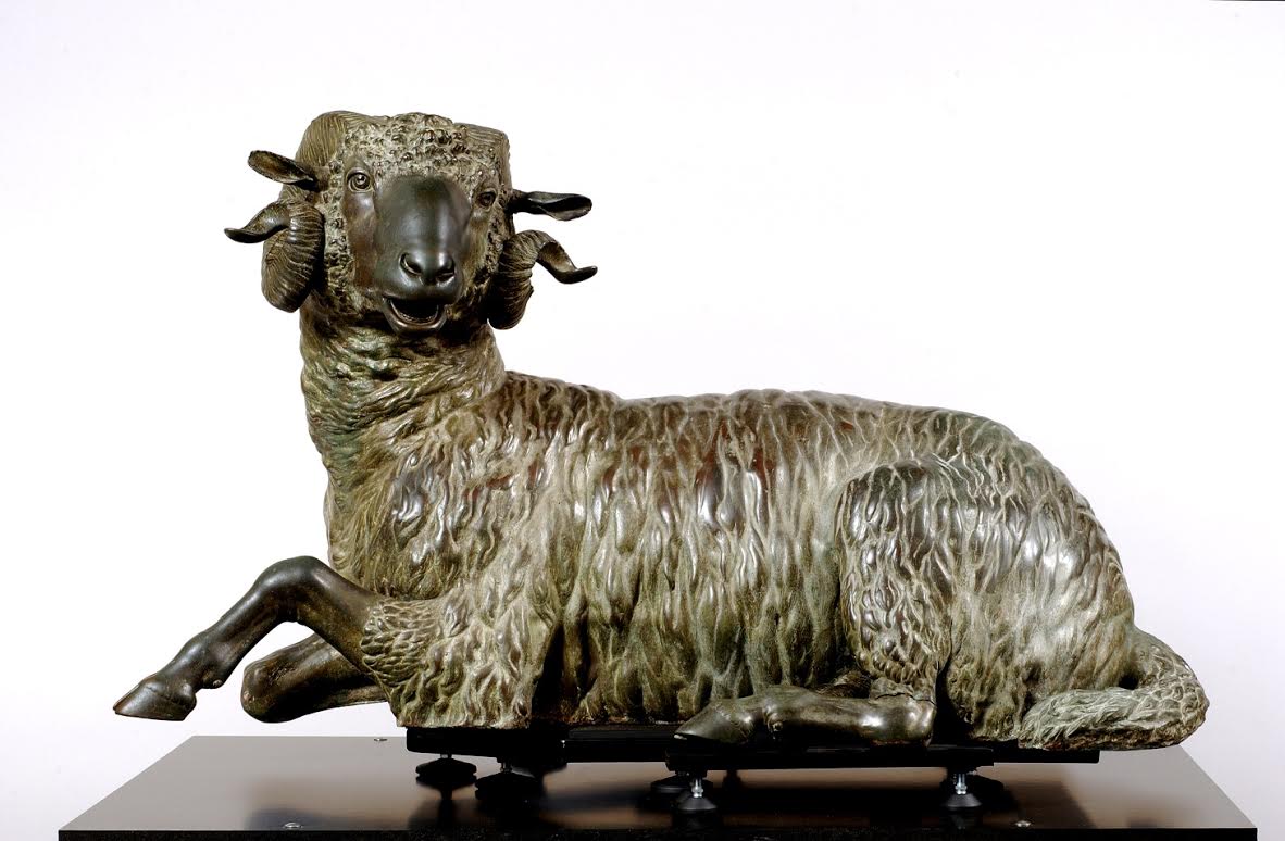 L’animale è raffigurato accovacciato. La testa è ruotata completamente a sinistra, con i grandi occhi spalancati. Le narici dilatate e le orecchie tese sopra le corna a spirale. Nella bocca semiaperta si vedono i denti dell’arcata inferiore. La fronte e la porzione sottostante alle corna sono ricoperte da fitti riccioli. La zampa posteriore destra dell’ariete non è visibile; delle due anteriori, la destra è ripiegata su se stessa, la sinistra è portata in avanti, con lo zoccolo ben aderente alla base. Sullo zoccolo anteriore sinistro, dopo la pulitura effettuata nel corso del recente restauro, sono risultati chiaramente visibili alcuni segni incisi e cioè una lettera D tagliata a metà, seguita da due stanghette verticali, che possono essere interpretati come un numerale. La D tagliata a metà da un tratto orizzontale è usata frequentemente in età imperiale romana per indicare 500. La statua appare piuttosto isolata nel panorama artistico del mondo greco-romano. Rare sono infatti le rappresentazioni di singoli animali di così grandi dimensioni; rarissime poi quelle in bronzo che si sono conservate. Mancano quindi i confronti con pezzi analoghi, mentre sono numerose le raffigurazioni di ariete nella piccola plastica in terracotta o in bronzo, raramente però in posizione accovacciata. L’opera è stata eseguita con il metodo della fusione a cera persa, effettuata in parti separate poi saldate al corpo. Per i caratteri stilistici l’ariete è stato datato tra gli inizi e la metà del III secolo a.C. ma recentemente si è proposta una datazione più bassa al II sec. d.C.