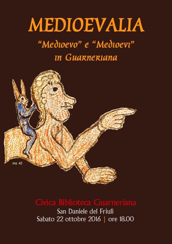 SAN DANIELE DEL FRIULI (UD) – Sabato 22 ottobre con inizio alle h. 18 presso la Civica Biblioteca Guarneriana di San Daniele del Friuli (UD) si terrà la giornata di studi MEDIOEVALIA: “Medioevo” e “Medioevi” in Guarneriana. La giornata, che si tiene nel mese delle celebrazioni in occasione del 550° anniversario della fondazione della Biblioteca, si aprirà con un incontro con il dott. Andreas M.Steiner, Direttore della rivista Medioevo,  che presenterà il numero di ottobre 2016 del mensile che contiene lo speciale sul manoscritto Fontaniniano 200, il cosiddetto “Dante Guarneriano”. Seguirà un convegno sul tema “LE EDIZIONI FACSIMILARI: un’opera tra storia e memoria”. Interverranno la dott.ssa  Elena Percivaldi, storica e saggista, parlando de”L’Editto di Rotari e Paolo Diacono storico dei Longobardi. La conoscenza storica che precede le edizioni facsimilari”; poi  l’editore Enrico Chigioni presenterà  “Le edizioni dell’Historia Langobardorum e delle Leges Langobardorum” in corso di pubblicazione per  CAPSA Ars Scriptoria. Lo scrigno del Tempo, I Longobardi; infine  l’editore  Roberto Vattori illustrerà  “L’edizione del ms. 200 “Dante Guarneriano”” da lui pubblicata. Introduce il conservatore della Biblioteca Guarneriana, dott. Angelo Floramo. Ingresso gratuito fino a esaurimento posti.