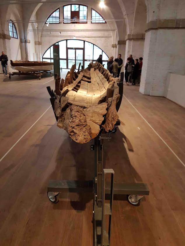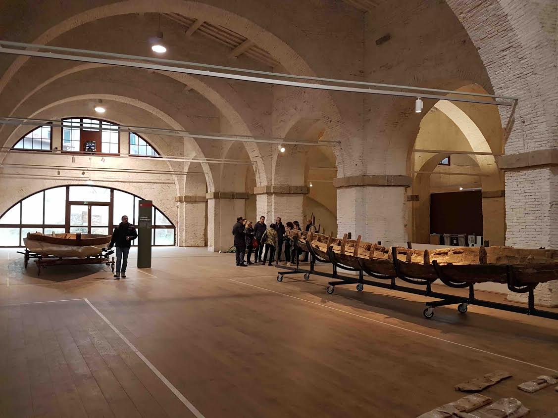 L’ALLESTIMENTO – I primi due ambienti ad essere aperti al pubblico (saranno poi 8 in tutto) sono la sala V e, con una sezione introduttiva a questa, la sala IV, con l’esposizione della prima imbarcazione rinvenuta, la nave A ( lunga 18 metri e risalente al II secolo d.C). Nella grande sala V saranno esposte tutte le navi restaurate: da guerra, da commercio, da mare aperto e da fiume. Al momento, qui si possono vedere la Nave F (del II sec. d.C), che rientra nella categoria delle piccole imbarcazioni fluviali, veloci, a forma di piroga, dalla caratteristica prua monossile, ossia scolpita in un unico blocco. Lo scafo è deformato per il pilotaggio da un solo lato, come le gondole; la Nave I (del IV-V secolo d.C) è un traghetto a fondo piatto interamente realizzato in legno di quercia e rivestito all’esterno da fasce chiodate in ferro per proteggere lo scafo dai fondali bassi. La nave era manovrata a riva da un argano; la Nave D ((VI sec. d.C) sarà visibile posta su una grande struttura metallica, che sosterrà questa imponente imbarcazione, lunga 13 metri e larga più di 4: una nave fluviale adibita al trasporto di sabbia, trainata da riva da una coppia di cavalli. È inoltre presente la ricostruzione a grandezza naturale della Nave C, l’Alkedo (inizi I sec. d.C.), finalmente libera dal guscio che la ha protetta per 15 anni. Consistenti tracce di colore hanno permesso di riprodurre il suo colore originale, in bianco con rifiniture in rosso e il nero per il simbolo dell’occhio, dipinto sulla prua a protezione delle avversità di chi va per mare.