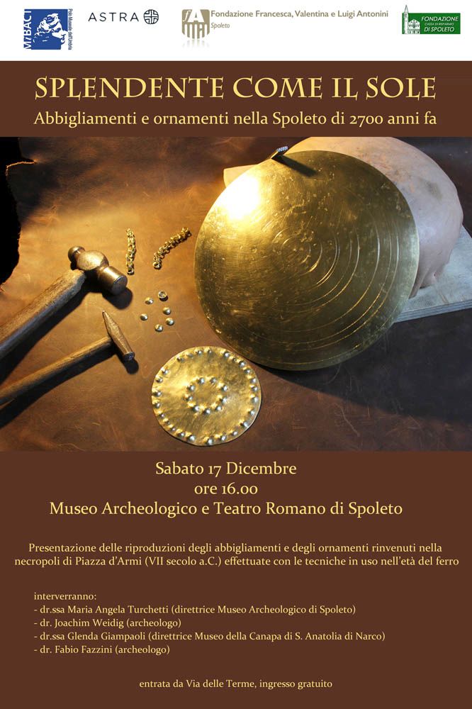 SPOLETO (PG) [da Tuttoggi.info] – Sabato 17 dicembre 2016 presso il Museo Archeologico Nazionale e Teatro Romano di Spoleto, alle ore 16.00, verranno presentate ed esposte al pubblico le fedeli riproduzioni di alcuni indumenti ed ornamenti indossati dalla comunità che visse a Spoleto nel VII secolo a.C.