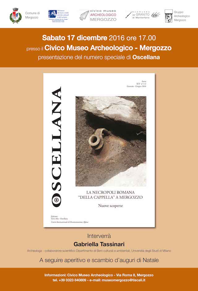 MERGOZZO (VB) – Oggi pomeriggio, sabato 17 dicembre, alle 17 presso il Civico Museo Archeologico di Mergozzo si terrà la presentazione del numero speciale della rivista “Oscellana” dedicato alle nuove scoperte effettuate durante gli scavi archeologici dell’estate 2013. La presentazione è affidata all’archeologa Gabriella Tassinari, collaboratrice del Dipartimento di Beni culturali e ambientali dell’Università degli Studi di Milano.