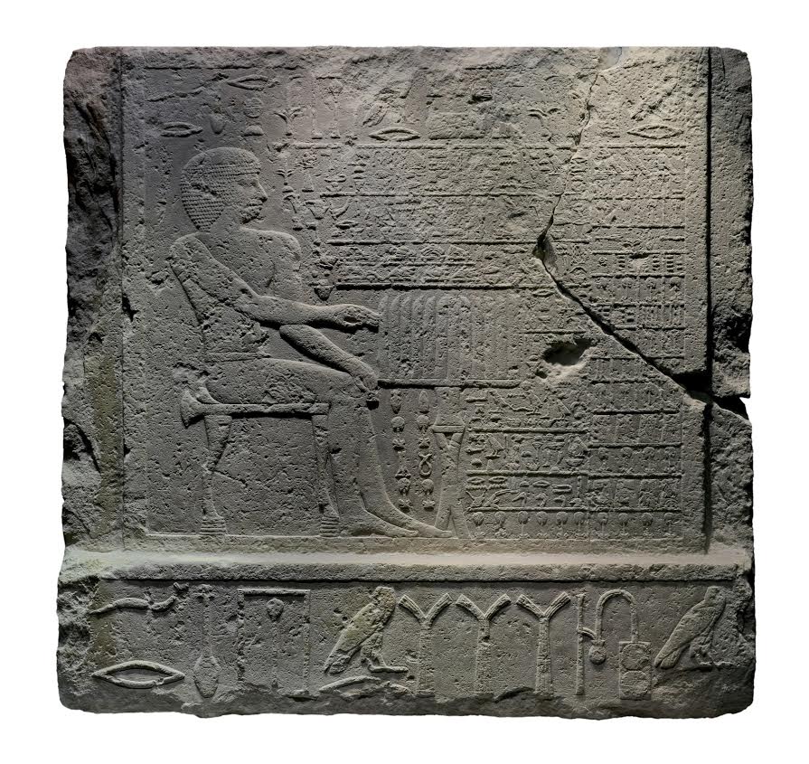 La stele del Museo Barracco fu acquistata da Giovanni Barracco a un’asta a Parigi nel 1868: si vendevano in quell’occasione le opere della collezione di Napoléon-Joseph-Charles-Paul Bonaparte, detto Plon Plon, figlio del fratello minore di Napoleone I. Il principe aveva progettato, per il 1858, un viaggio in Egitto, sulle orme della spedizione napoleonica del 1798-1801. Per accogliere degnamente un ospite così illustre il governatore d’Egitto, Said Pacha, decise di organizzare preventivamente una serie di campagne di scavo in modo che il principe potesse provare il piacere della “scoperta” dei tesori archeologici dell’ Egitto faraonico che emergevano, come per incanto, dalla sabbia del deserto.