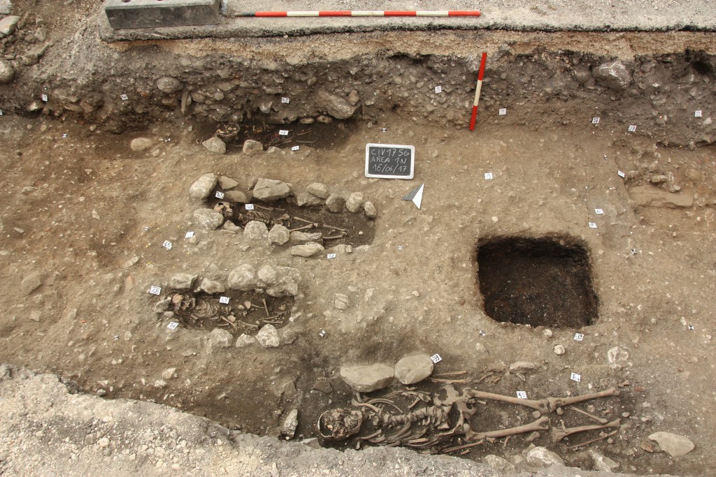 Si tratta, come rende noto la Soprintendenza stessa in un comunicato, di parte di una necropoli di età longobarda (la datazione è attualmente in via di definizione tra VI e VIII secolo), con sepolture pertinenti a individui locali, sepolti senza corredo in quanto non di cultura germanica. Il sepolcreto era posizionato su un’area precedentemente occupata da un focolare interrato di età tardo romana e da probabili apprestamenti lignei sistemati in prossimità di una struttura, forse di terrazzamento, legata alla presenza delle mura urbiche. Un contesto che ci permette di immaginare un paesaggio antico caratterizzato dalla presenza di un’area aperta adibita a cimitero, verosimilmente formatosi in relazione all’impianto più antico della chiesa, con annesso xenodochio (una struttura di accoglienza spesso posizionata presso le porte urbiche) di fondazione longobarda, attestato già nell’VIII secolo su terreni fiscali di proprietà del duca longobardo Rodoaldo.