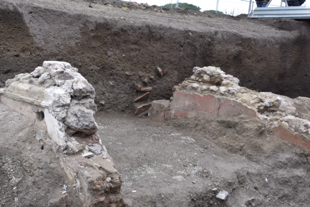 DOMUS E VICOLI – Poco oltre, sta emergendo il vicolo che partendo da via di Nola fiancheggiava la Casa delle nozze d’Argento. Leggermente in salita, si presenta nella sua originaria configurazione con lo zoccolo dei marciapiedi e gli ingressi degli edifici che vi si affacciavano. Nel Vicolo delle Nozze d’Argento stanno venendo alla luce alcune strutture archeologiche, tra le quali l’ingresso di una domus, con pareti affrescate a riquadri su fondo rosso con al centro l’immagine dipinta di una coppia di delfini.
