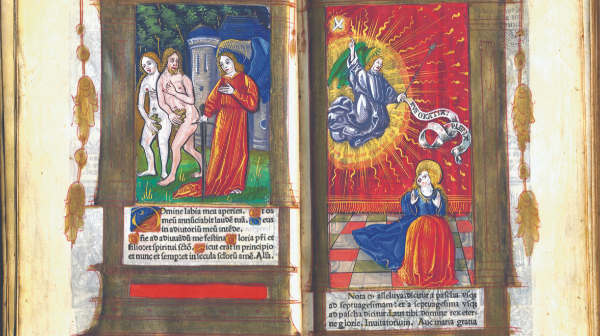 LA BELLEZZA DEI LIBRI D’ORE – I Libri d’Ore, libri di preghiera contenenti i testi religiosi del Breviario e del Salterio, da recitare nelle diverse ore della giornata, presentavano un ampio ventaglio di soluzioni decorative. L’estensione e la qualità delle miniature, su pergamena o su carta, dipendevano dalle disponibilità finanziarie del committente che, se di alto lignaggio, poteva rivolgersi a un miniatore famoso. La pagina divenne così campo d’espressione artistica, testimone del gusto e del costume del tempo. Accanto agli esemplari riccamente decorati in oro e lapislazzulo, carichi di dipinti a piena pagina, di capilettera istoriati, destinati a principi, sovrani e dignitari di corte, o presentati come dono nuziale, fiorì un’intensa produzione di copie d’uso rubricate in rosso e blu, ornate da illustrazioni miniate di minor estensione o, con l’unica decorazione dei capilettera.