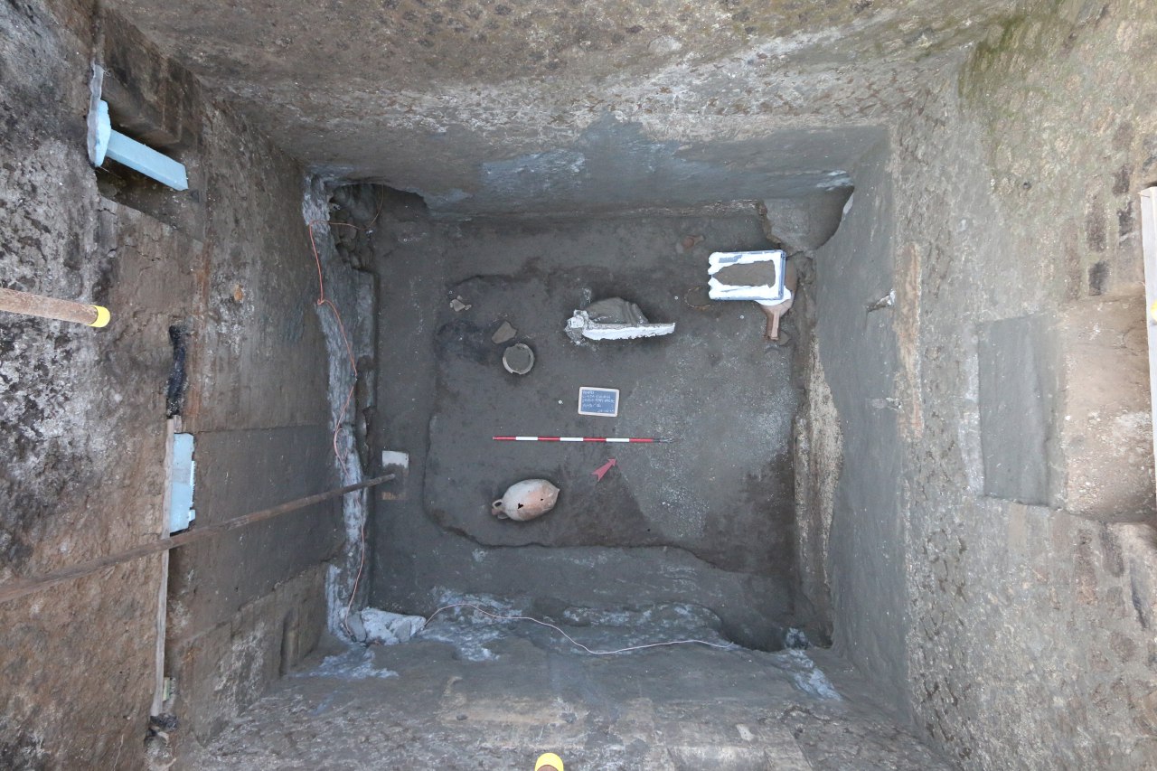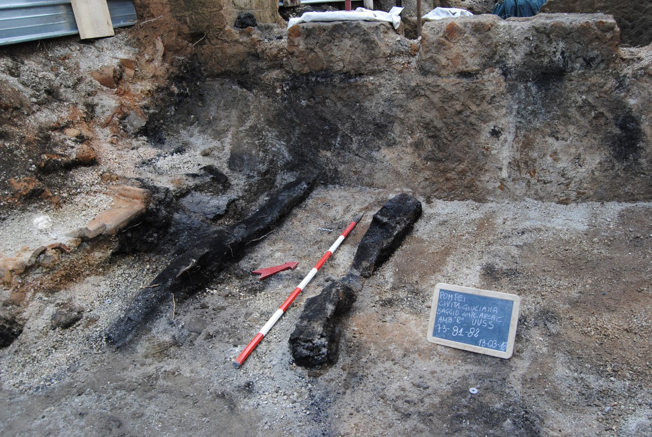 L’intervento ha portato alla luce una serie di ambienti di servizio di una grande villa suburbana conservata in maniera eccezionale, dalla quale sono emersi anche diversi reperti (anfore, utensili da cucina, parte di un letto in legno di cui è stato possibile realizzare il calco) e una tomba a cassa di tegole con tumulo e tubo fittile per le libagioni, posta sulla cresta del muro meridionale dell’edificio, del periodo post 79 d.C. che custodiva lo scheletro del defunto (sotto), e che dunque testimonia l’occupazione del sito posteriore all’eruzione.