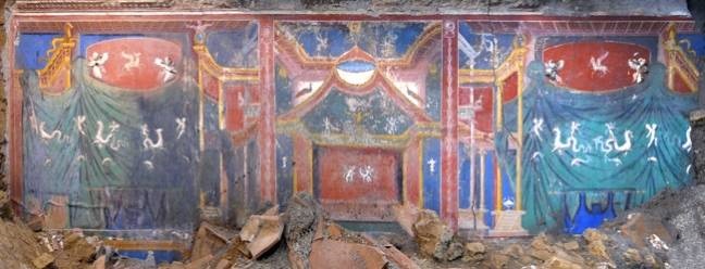 IL TERREMOTO DEL 79 – La lussuosa residenza fu danneggiata in modo irreversibile dall’eruzione vesuviana che distrusse Pompei. La colonna eruttiva si innalzò nell’atmosfera per oltre venti chilometri, superando l’alta dorsale dei monti Lattari e ricadendo verso sud. Le forti piogge, che sempre si associano alle eruzioni, attivarono valanghe di fango che si ingrossarono verso il fondovalle e si consolidarono rapidamente. I tetti spioventi favorirono lo scivolamento delle pomici verso l’esterno, solo piccoli quantitativi entrarono da porte e finestre. Poco dopo valanghe di fango raggiunsero la villa con una velocità rilevante, riempiendone gli ambienti e facendo crollare, sotto l’enorme spinta, tetti e solai. Le colonne in stucco del portico furono abbattute e trascinate all’interno del triclinio, mentre contro la parete nord si accumulava il materiale ligneo del soffitto, dei tramezzi e delle stesse impalcature dei restauri in corso. Questo accumulo ha protetto i resti di un armadio che conservava il vasellame bronzeo. La parte mediana della parete est subì uno spostamento di circa quaranta centimetri verso valle, testimoniato da un’ampia frattura, la prova più spettacolare della violenza dell’evento.