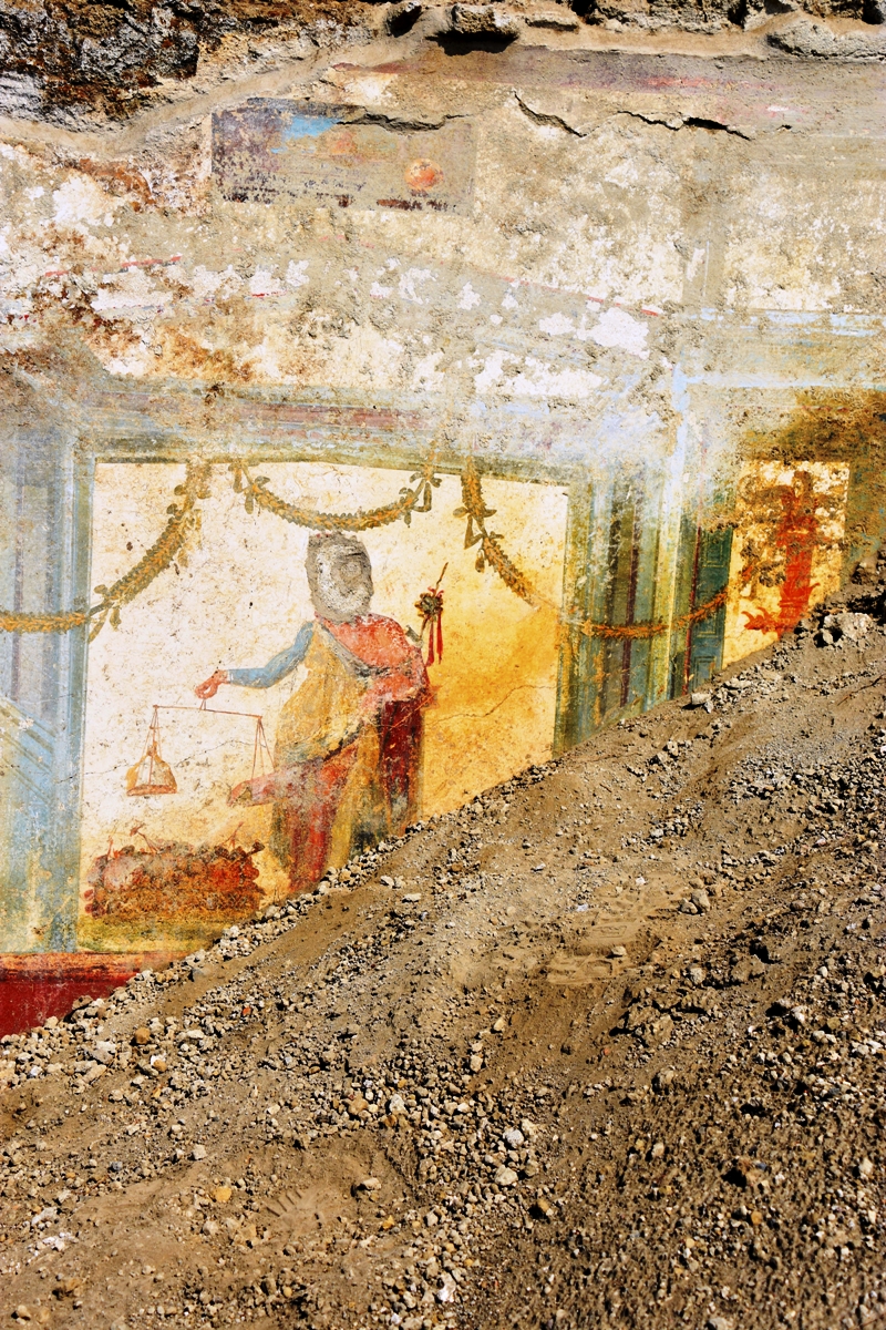 POMPEI (NA) – Un dimora di pregio su via del Vesuvio con stanze elegantemente decorate e all’ingresso un Priapo affrescato, in atto di pesare il membro su una bilancia, sono emersi nel corso dei lavori di riprofilatura dei versanti della Regio V che affacciano sulla via di Vesuvio, nell’ambito del cantiere dei nuovi scavi.