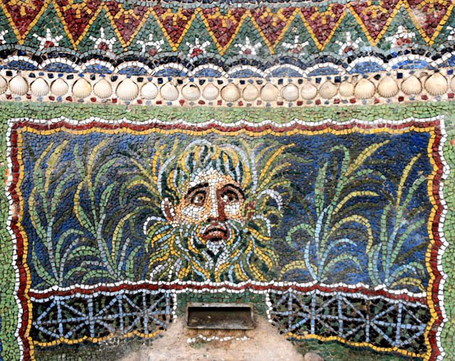 L’impianto originario della Casa della Fontana grande risale alla prima metà del II secolo a. C., ma solo nel I secolo d.C fu addossata al muro di fondo la grande fontana ad abside rivestita con mosaici e conchiglie e ornata da due maschere teatrali in marmo, che dà oggi il nome alla dimora. Al centro della fontana si trova una base cilindrica con un foro centrale che all’epoca della scoperta tra il 1826 e il 1827 si presentava priva di elementi decorativi. Fra Ottocento e Novecento venne posizionata sulla base al centro della fontana una copia di un puttino con delfino scoperto nel 1880 nel giardino della casa degli archi; tale sistemazione, concepita forse in analogia con la vicina casa della Fontana Piccola, al cui centro si trova una statuetta di puttino con oca, è stata in seguito mantenuta per diversi decenni nel corso del Novecento. L’allestimento oggi presentato ripropone dunque tale storica sistemazione e restituisce così l’immagine consolidata della domus nell’ultimo secolo.