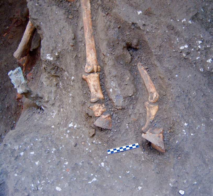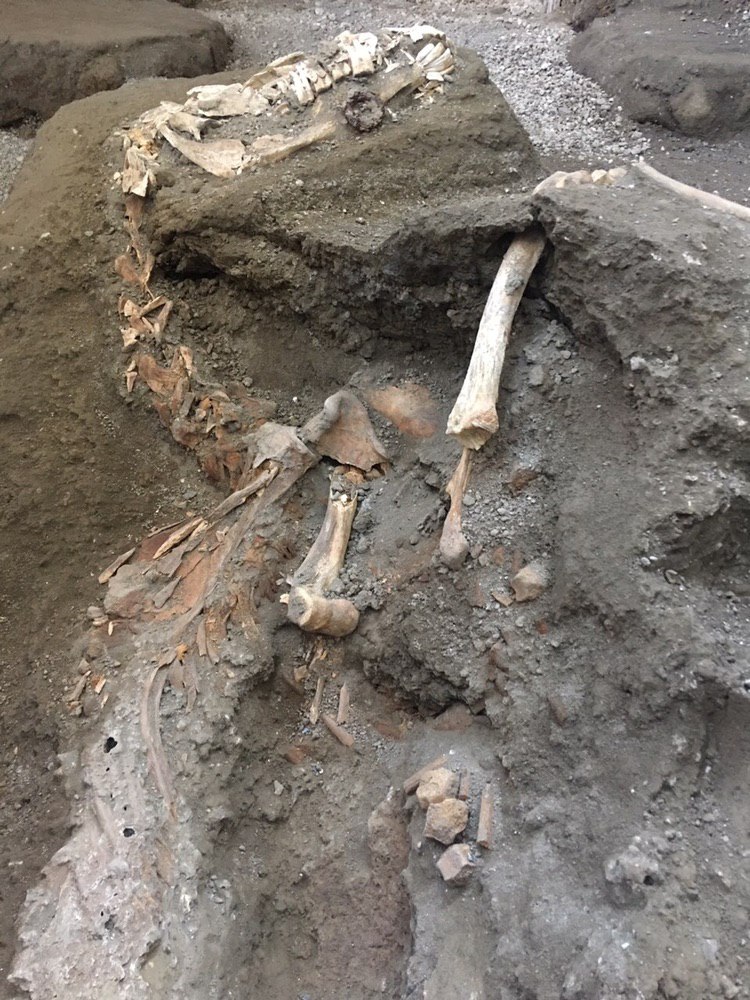 Dei due, l’uno giace riverso sul fianco destro, con il cranio ripiegato sulla zampa anteriore sinistra. Presumibilmente legato alla mangiatoia, non era riuscito a divincolarsi.