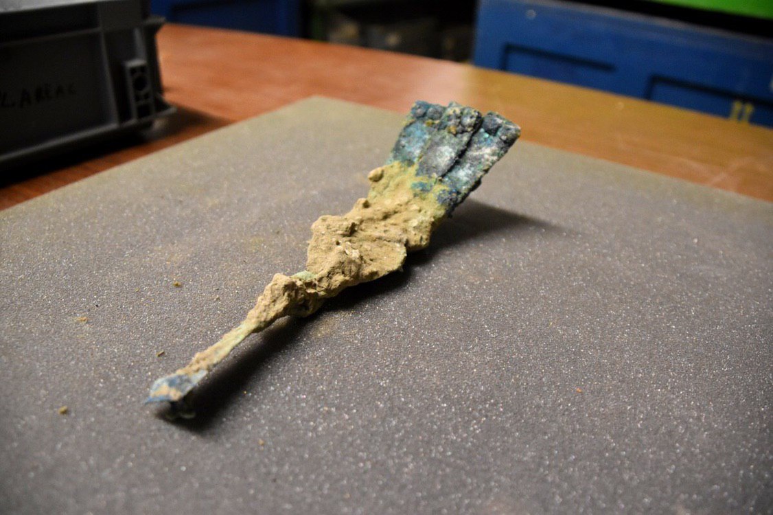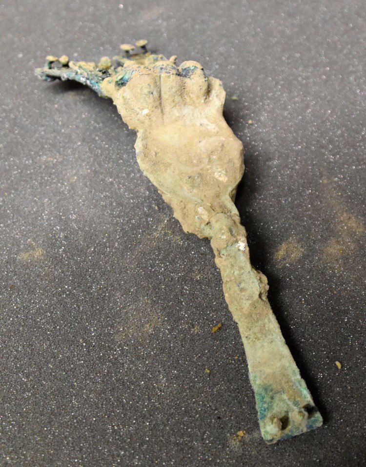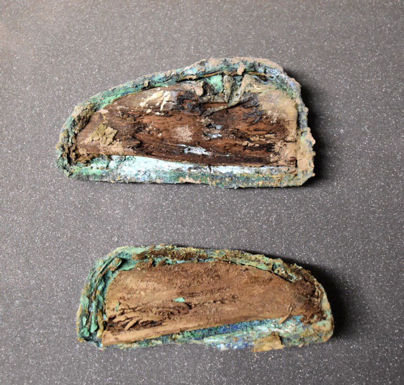 Durante la fasi di scavo del corpo sono, inoltre, venuti alla luce cinque reperti bronzei. Sulle coste della gabbia toracica, fortemente rimaneggiate, si sono individuati quattro reperti in legno di conifera rivestiti di lamina bronzea di forma semilunata ; un quinto oggetto, sempre in bronzo, è stato recuperato sotto il ventre, in prossimità degli arti anteriori, formato da tre ganci con rivetti collegati da un anello a un disco.