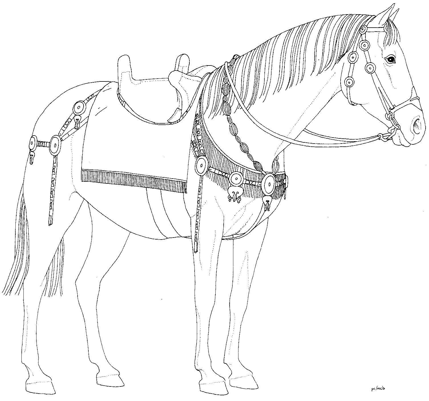 Ulteriori elementi riferibili agli “ornamenta” del cavallo sono documentati dietro la schiena, dove tracce di fibre vegetali lasciano ipotizzare la presenza di un drappo/mantello e nello spazio tra le zampe posteriori ed anteriori, in cui un ulteriore calco suggerisce la presenza di una sacca. E’ probabile che parte dei mancanti finimenti siano stati trafugati dai tombaroli.