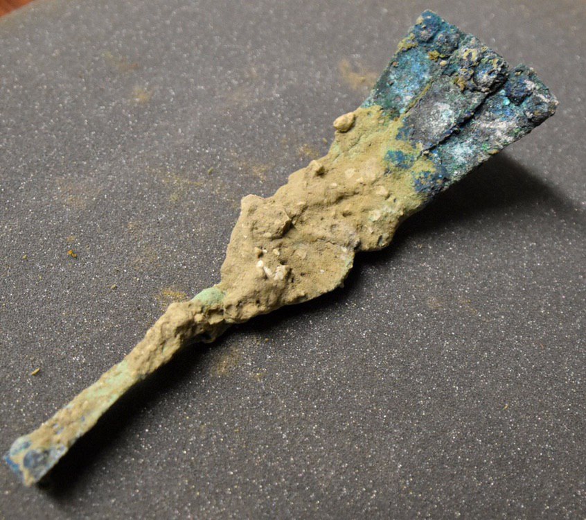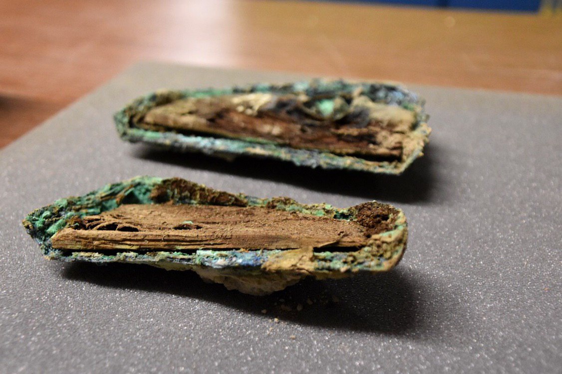 Durante la fasi di scavo del corpo sono, inoltre, venuti alla luce cinque reperti bronzei. Sulle coste della gabbia toracica, fortemente rimaneggiate, si sono individuati quattro reperti in legno di conifera rivestiti di lamina bronzea di forma semilunata ; un quinto oggetto, sempre in bronzo, è stato recuperato sotto il ventre, in prossimità degli arti anteriori, formato da tre ganci con rivetti collegati da un anello a un disco.