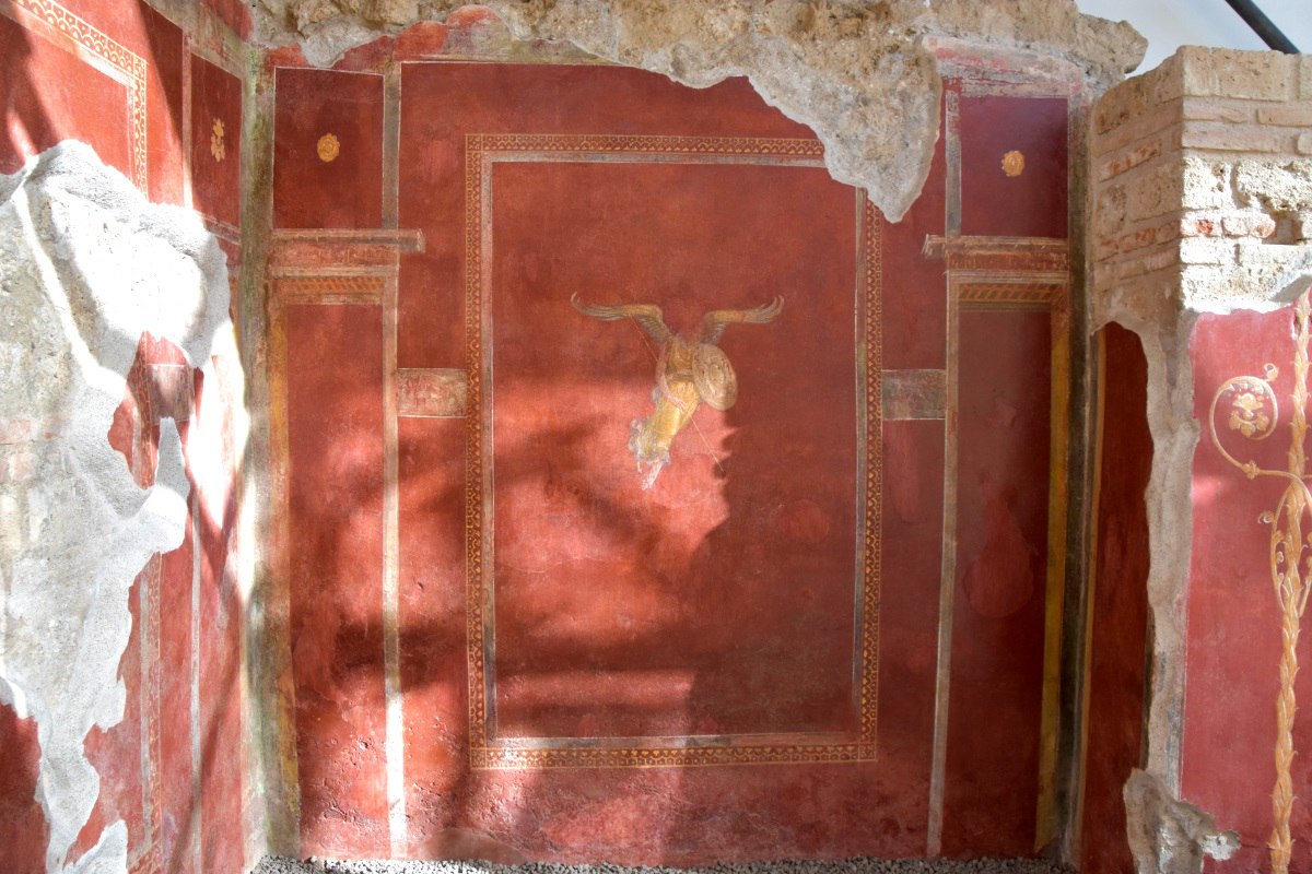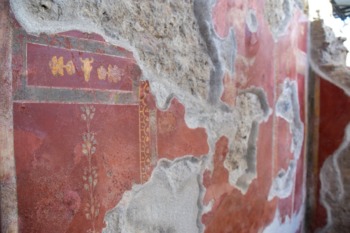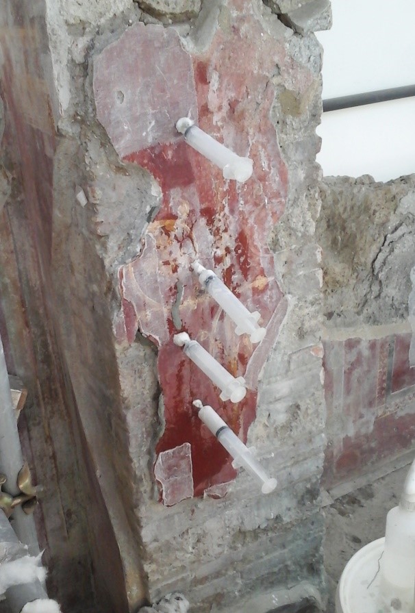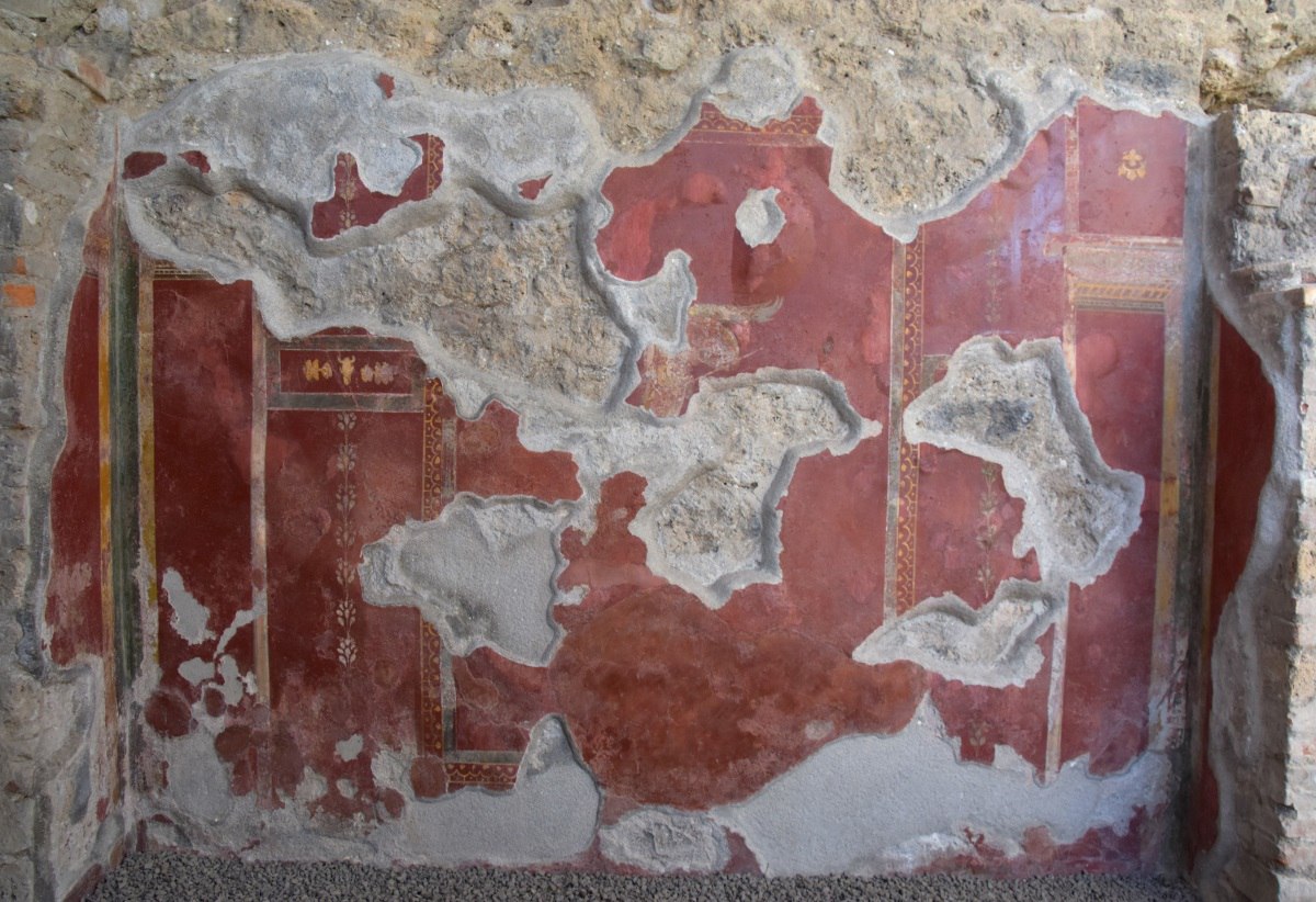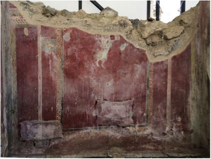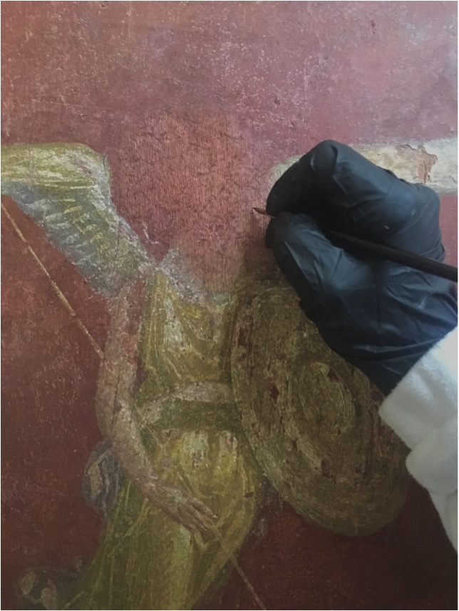 Gli interventi di recupero hanno avuto inizio nel 2016 con il supporto tecnico di Ales, la struttura interna del Mibac che si occupa da più di tre anni della manutenzione programmata di Pompei. Realizzata una copertura temporanea che consentisse l’avvio dei lavori, si è proceduto inizialmente alla messa in sicurezza delle strutture e degli apparati decorativi, per evitare l’ulteriore perdita di porzioni originali. E’ stato cioè necessario in una prima fase ripristinare la stabilità delle murature e degli intonaci superstiti, fortemente compromessa dalle sollecitazioni dovute al crollo della copertura e delle pareti laterali. Successivamente si è intervenuti sulle superfici dipinte agendo in parallelo, sulle pareti conservate all’interno dell’edificio e ricomponendo in laboratorio i frammenti recuperati dopo il crollo. Si è scelto di ripristinare la leggibilità figurativa attraverso un’attenta pulitura e un’accurata presentazione estetica, pur garantendo la riconoscibilità dell’intervento. In particolare il trattamento delle lacune presenti sulle pareti dipinte è stato oggetto di un’approfondita riflessione critica. Si è scelto di adottare il ‘tratteggio’, una tecnica messa a punto dall’Istituto Centrale del Restauro negli anni ’40, che consiste nell’accostamento di leggerissimi tratteggi verticali ravvicinati che ripropongono la policromia originale e consentono di ripristinare l’unità dell’immagine perduta, garantendo tuttavia la possibilità di distinguere da vicino l’intervento di restauro.