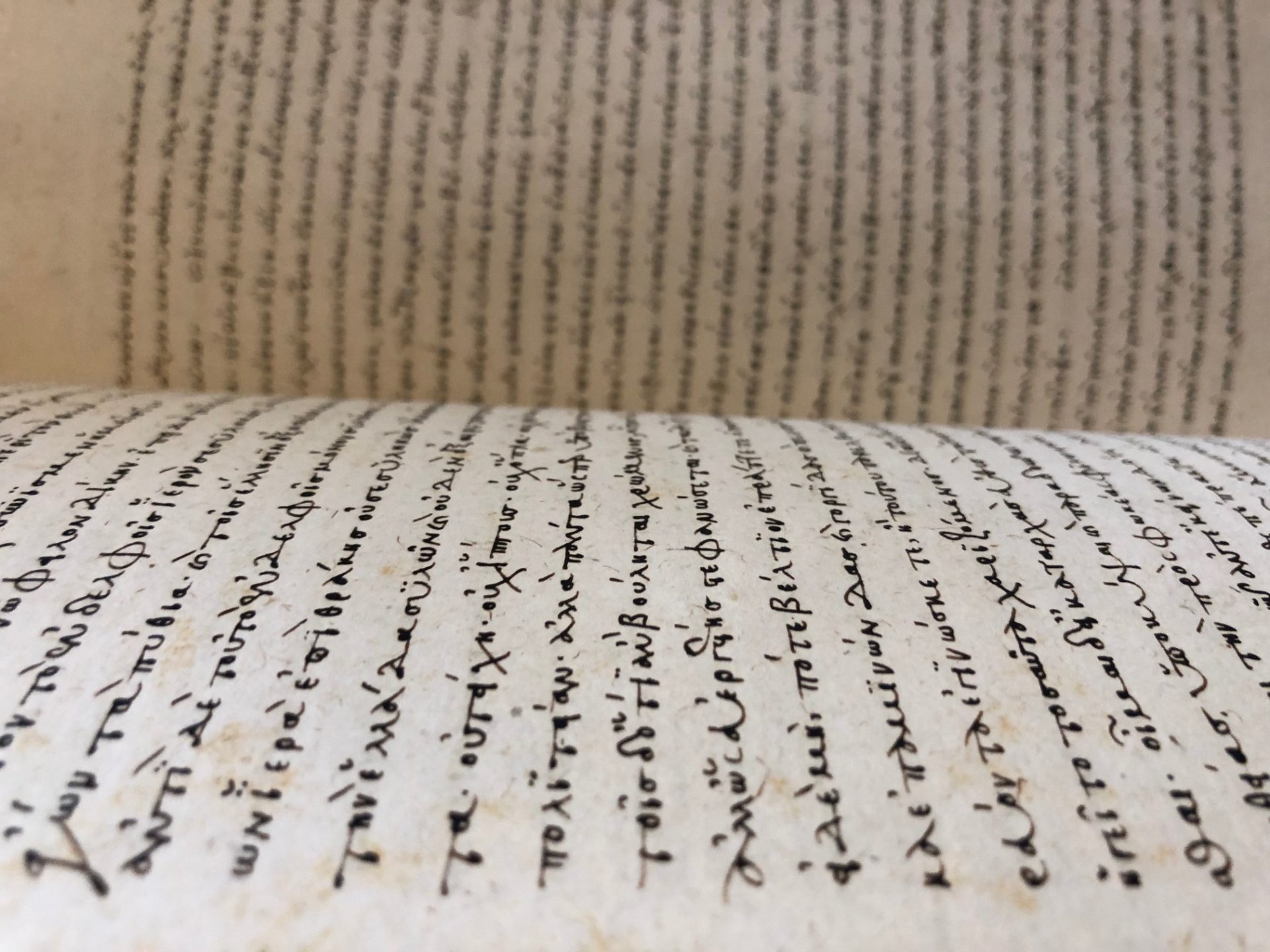 IL CODICE MALATESTIANO – Il manoscritto, cartaceo, consta di 366 carte ( mm 310 × 230), fu scritto da un unico copista in minuscola greca ed è databile alla seconda metà del XIV secolo. Al suo interno contiene le orazioni dell’oratore greco Aristide vissuto nel II sec. d.C. La decorazione comprende a c. 1r un fregio, consistente in una semplice doppia cornice con elementi decorativi fitomorfi, in inchiostro rosso; alle cc. 62v, 88r, 97v, 113v, 364r; bande in inchiostro rosso con elementi decorativi geometrici o fitomorfi, che separano i testi; rubriche; iniziali calligrafiche, sovramodulate in inchiostro rosso all’inizio dei singoli testi; segni a forma di penna per richiamare l’attenzione su alcuni passi, realizzati nello stesso inchiostro bruno utilizzato per la scrittura del testo. La coperta in cuoio marrone scuro su assi di legno è l’originale malatestiana. Il piatto anteriore e quello posteriore presentano una decorazione con impressioni a secco, costituita da una doppia cornice formata da triplici filetti e decorata con elementi geometrici; lo spazio risultante fra le due cornici è ulteriormente partito da quattro diagonali, sempre formate da triplici filetti. Su entrambi i piatti sono presenti cinque borchie in ferro di forma quadrilobata, una posta al centro e quattro negli angoli. Sul labbro inferiore del piatto posteriore è attaccata la catena originale. Un’antica