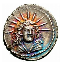 Agli inizi del periodo imperiale, la figura dell’imperatore venne idealmente associata a quella dello splendente Sol, e dunque così avvenne per le virtù titolari dell’imperatore (egli era definito Pius, Felix, Invictus). Il culto dell’Imperator trova origine già dalla propaganda politica promossa da Augusto durante il suo “principato”. Forse su esempio egizio, un tentativo venne fatto da Caligola (37-41 d.C), come dimostrano alcune monete fatte da lui coniare sulle quali l’imperatore viene ritratto con la testa adornata di corona radiata (sebbene un recente ritrovamento monetale abbia ben evidenziato come la “corona radiata” sia testimoniata su di un dupondio emesso da Nerone).