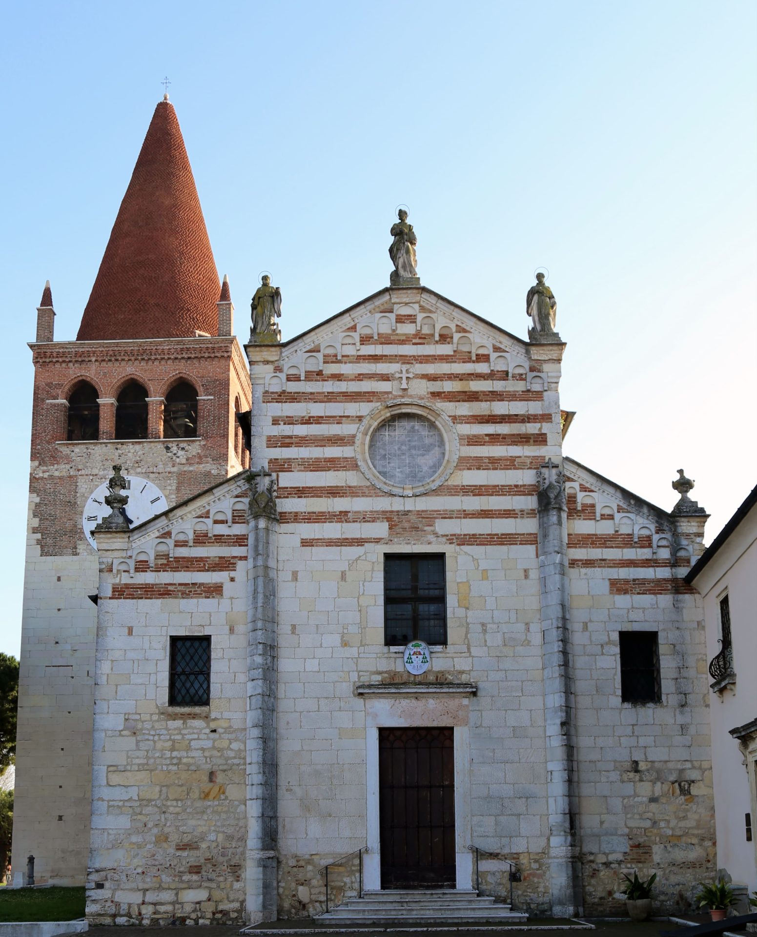 Nel 1117 il terremoto che colpì Verona lesionò la fiancata settentrionale e causò il crollo del prospetto di facciata, che fu ricostruito in maniera impeccabile rifacendosi ai prestigiosi e corroborati modelli urbani di San Zeno e della Cattedrale, ma anche alla pieve di San Floriano a San Floriano di Valpolicella. Il prospetto ha un profilo spezzato a quattro salienti che sottolineano la suddivisione interna in navate, accentuata dalla presenza di due contrafforti a sperone. Questi elementi, ampiamente testificati a Verona già dal secolo XI inoltrato (San Zeno, San Fermo), hanno la funzione di accogliere le spinte orizzontali delle arcate interne. La porzione centrale del fronte era enfatizzata da un protiro pensile e da una bifora, mentre i collaterali erano forati da due monofore.