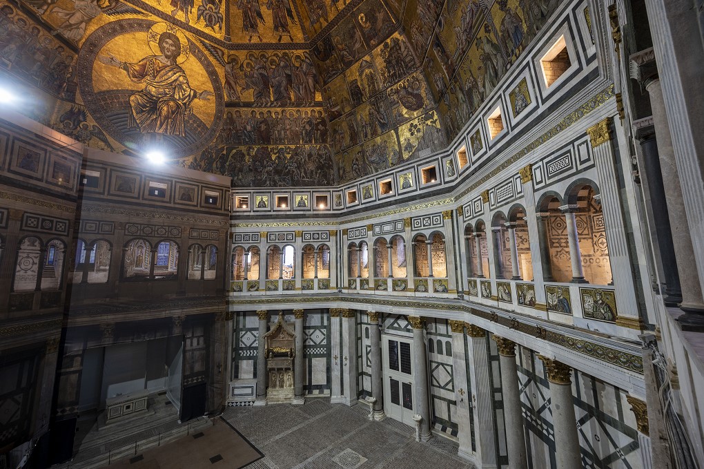 Finalmente ha riaperto al pubblico, e in tutto il suo splendore. Dal 3 luglio 2021 il Battistero di Firenze, il “bel san Giovanni” ricordato anche da Dante nella sua Commedia, è tornato fruibile al pubblico e per la prima volta sarà possibile vedere restaurate quattro delle otto pareti interne, in marmo bianco e verde di Prato, con i mosaici raffiguranti profeti, santi vescovi e cherubini, realizzati fra il primo e il secondo decennio del Trecento. Addossato a uno dei quattro lati restaurati, il monumento funebre dell’antipapa Giovanni XXIII, opera di Donatello e Michelozzo, risplende anch’esso, liberato dalle polveri superficiali che coprivano la doratura della figura bronzea.