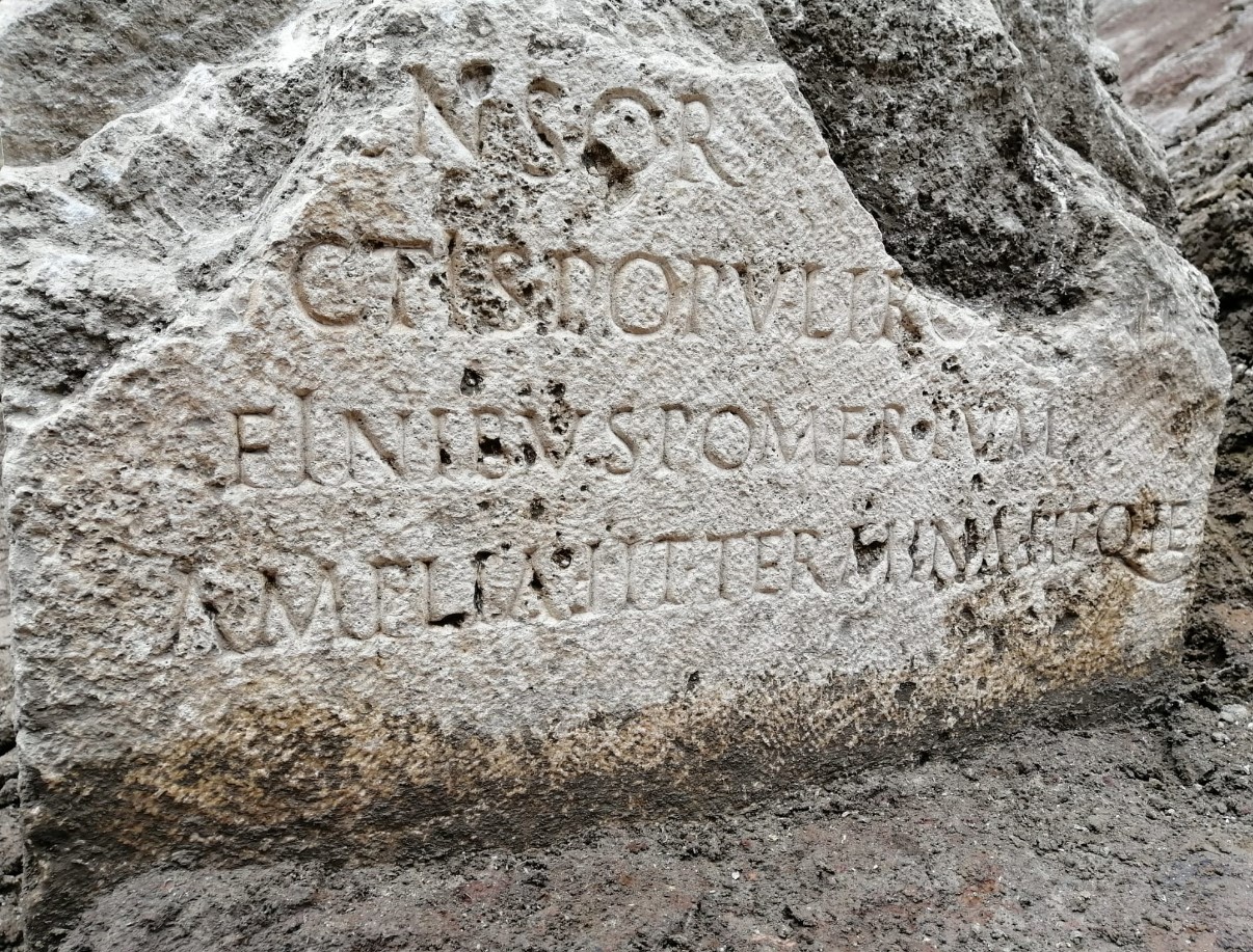 La stratificazione archeologica intorno al cippo venuto alla luce in piazza mostra la sua progressiva obliterazione a causa dell’innalzamento della quota di frequentazione dell’area. ll pomerio era il limite sacro che separava la città in senso stretto (urbs) dal territorio esterno (ager): uno spazio di terreno, lungo le mura, consacrato e delimitato con cippi di pietra, dove era vietato arare, abitare o erigere costruzioni e che era proibito attraversare in armi.