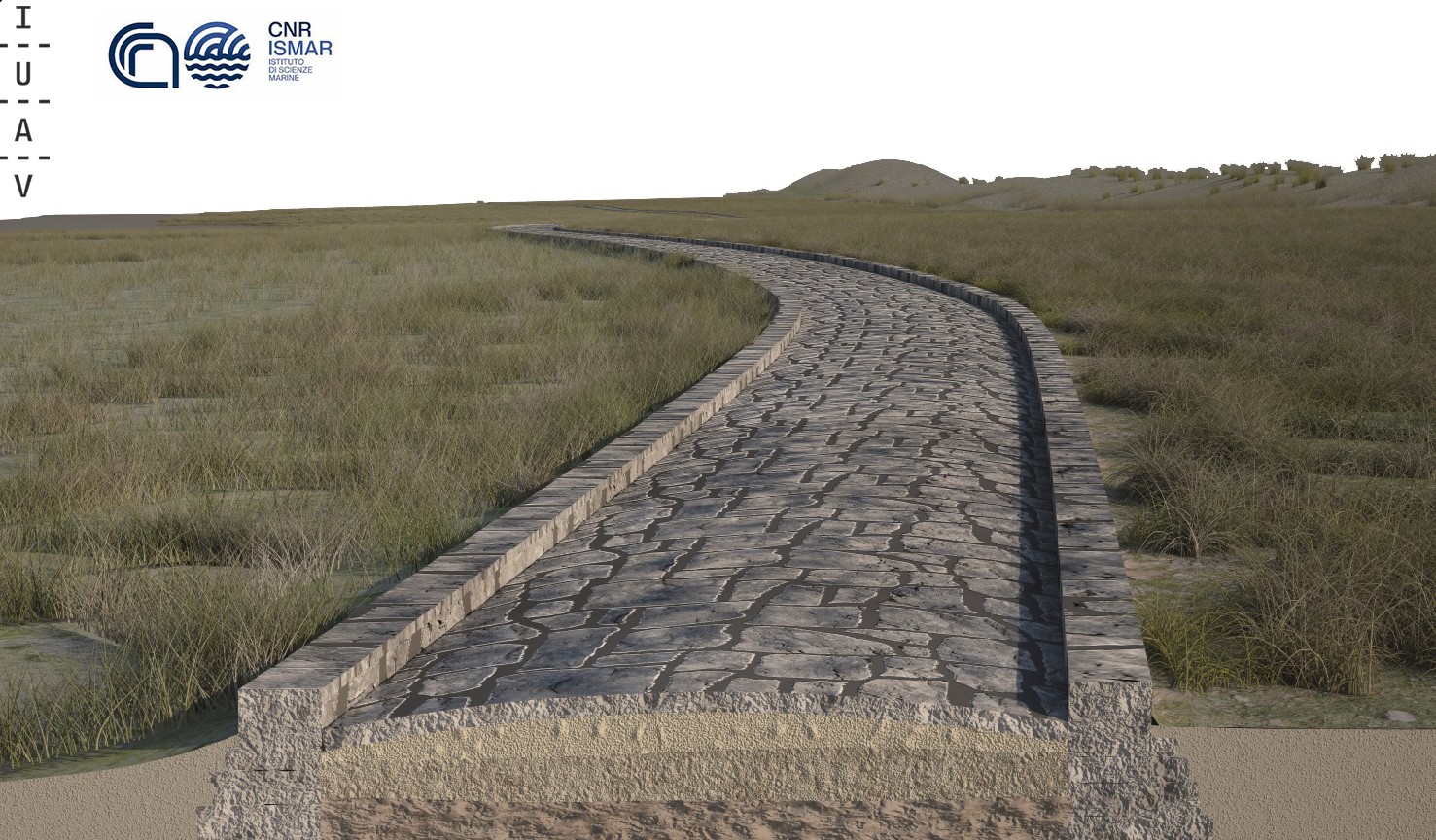Ricostruzione della strada romana nel Canale di Treporti nella Laguna di Venezia oggi sommersa. Crediti: Antonio Calandriello e Giuseppe D’Acunto (credit: Università Iuav di Venezia)