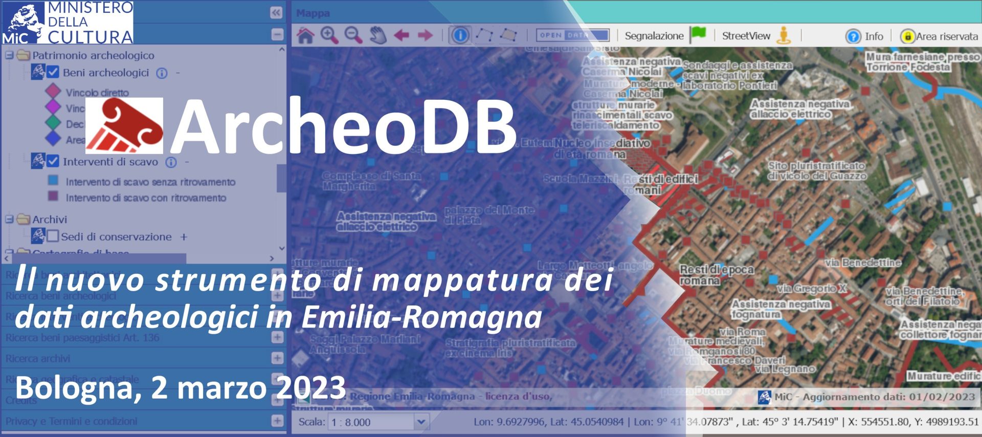 Giovedì 2 marzo 2023 gli istituti del Ministero della Cultura coinvolti presenteranno a Bologna il progetto di mappatura dei dati archeologici ArcheoDB, attivo in Emilia-Romagna e oggi consultabile anche online. Un progetto portato avanti – si legge nel comunicato diffuso dal Segretariato Regionale per l’Emilia Romagna – in primo luogo dal Segretariato e dalle Soprintendenze e che cresce con la collaborazione di tutti i professionisti che operano sul campo, che possono richiedere le credenziali, utilizzare le informazioni relative ai siti archeologici già censiti e aggiungere quelle mancanti derivanti dalla loro attività professionale, ad esempio in caso di VPIA o di consegna di nuova documentazione di scavo. Diventa così possibile inserire ogni informazione georeferenziata su una mappa che si aggiorna costantemente, evitando duplicazioni degli sforzi e mettendo immediatamente a disposizione della comunità tecnica e scientifica le acquisizioni, in un’ottica di trasparenza e continuo miglioramento. I dati per la consultazione sono messi a disposizione di cittadini e tecnici sul portale www.patrimonioculturale-er.it, dedicato a tutti i beni tutelati dell’Emilia-Romagna.