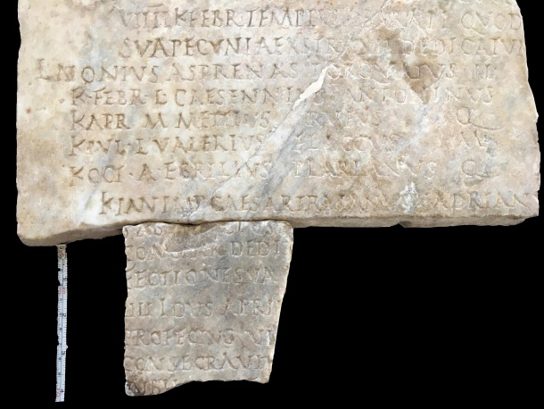 Uno dei due frammenti recuperati, che si congiunge perfettamente con un altro già conservato a Ostia e riferibile alla cronaca degli anni 126-128 d.C., menziona fatti e avvenimenti accaduti a Roma nel 128, sotto l’impero di Adriano. Incrociando queste informazioni con quelle provenienti da altre fonti (letterarie, epigrafiche e numismatiche), si è potuto precisare il contenuto del testo da cui si evince che il 1° gennaio del 128 Adriano assunse il titolo di pater patriae e la moglie Sabina quello di Augusta. Per celebrare questi titoli l’imperatore offrì al popolo un congiarium, cioè un’elargizione di denaro (Congiar Dedit, recita l’iscrizione).