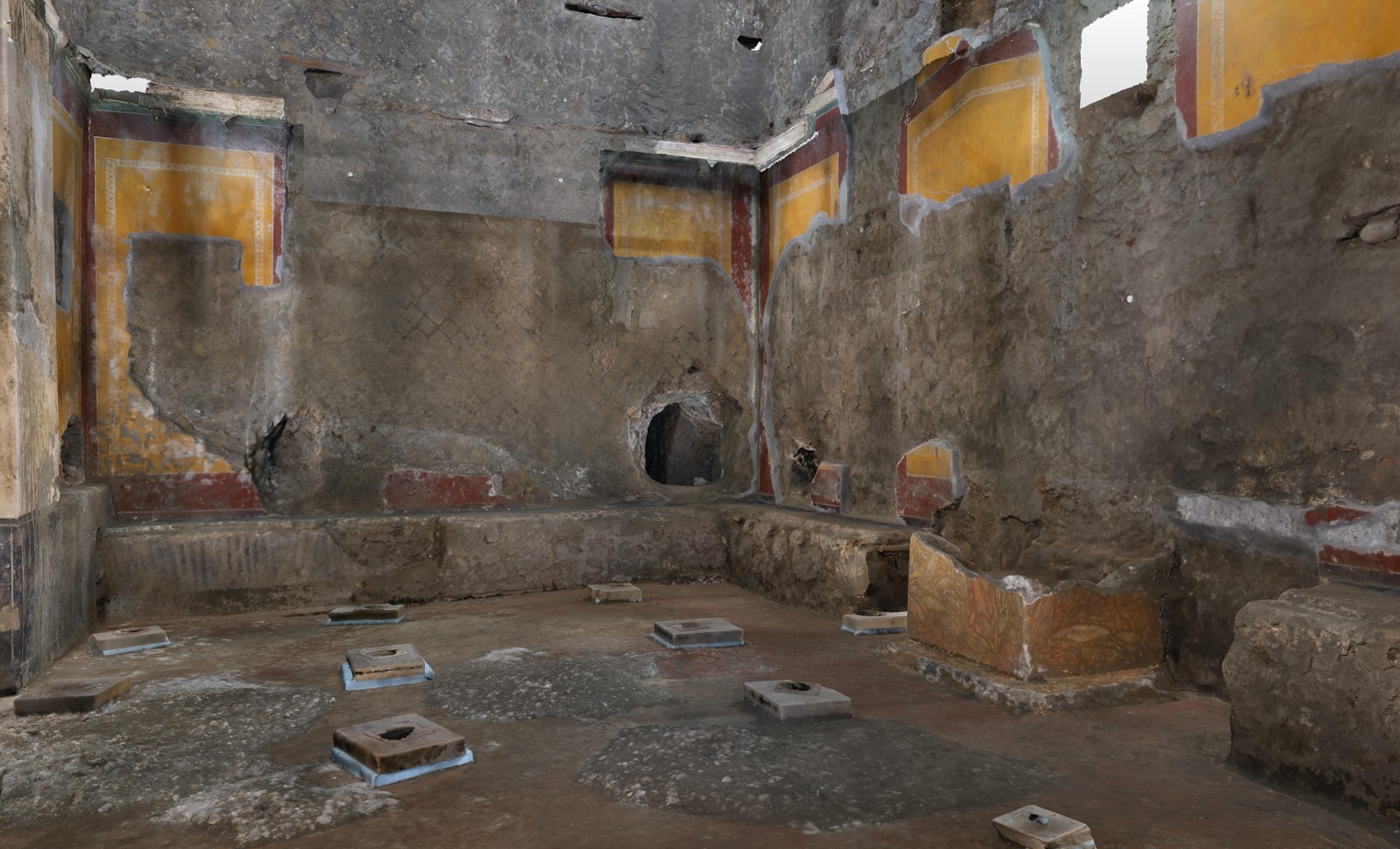 Gli ambienti indagati finora sono quelli dell’ampio quartiere produttivo e servile e hanno restituito finora diversi eccezionali testimonianze, tra cui una stalla con i resti di equidi bardati, in cui è stato possibile realizzare il primo calco intero di cavallo e uno spettacolare carro cerimoniale a quattro ruote, in legno e con elementi in ferro, con raffinate decorazioni in bronzo e argento, interpretato come pilentum, cioè un veicolo usato nel mondo romano dalle élite per cerimonie e in particolare per accompagnare la sposa nella nuova casa, esemplare unico nel suo genere al momento in Italia. E poi c’è la cosiddetta “stanza degli schiavi”, un ambiente servile che, grazie allo stato di conservazione eccezionale e alla possibilità di realizzare calchi in gesso di letti e altri oggetti in materiali deperibili che hanno lasciato la loro impronta nella cinerite, offre uno spaccato rarissimo della realtà quotidiana degli schiavi che vivevano e lavoravano nella villa.